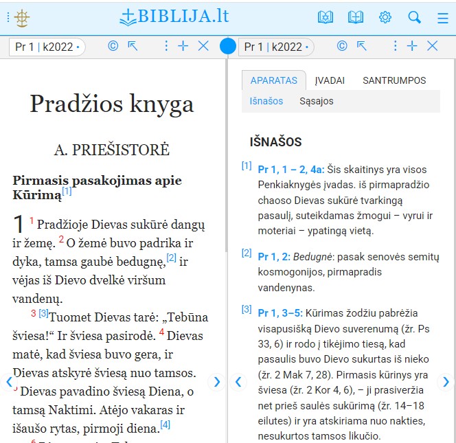 Adresu biblija.lt/txt visada atsidaro aktualiojo leidimo (k2022) Pradžios knygos 1 skyrius su jam skirtais abiejų tipų langais.
